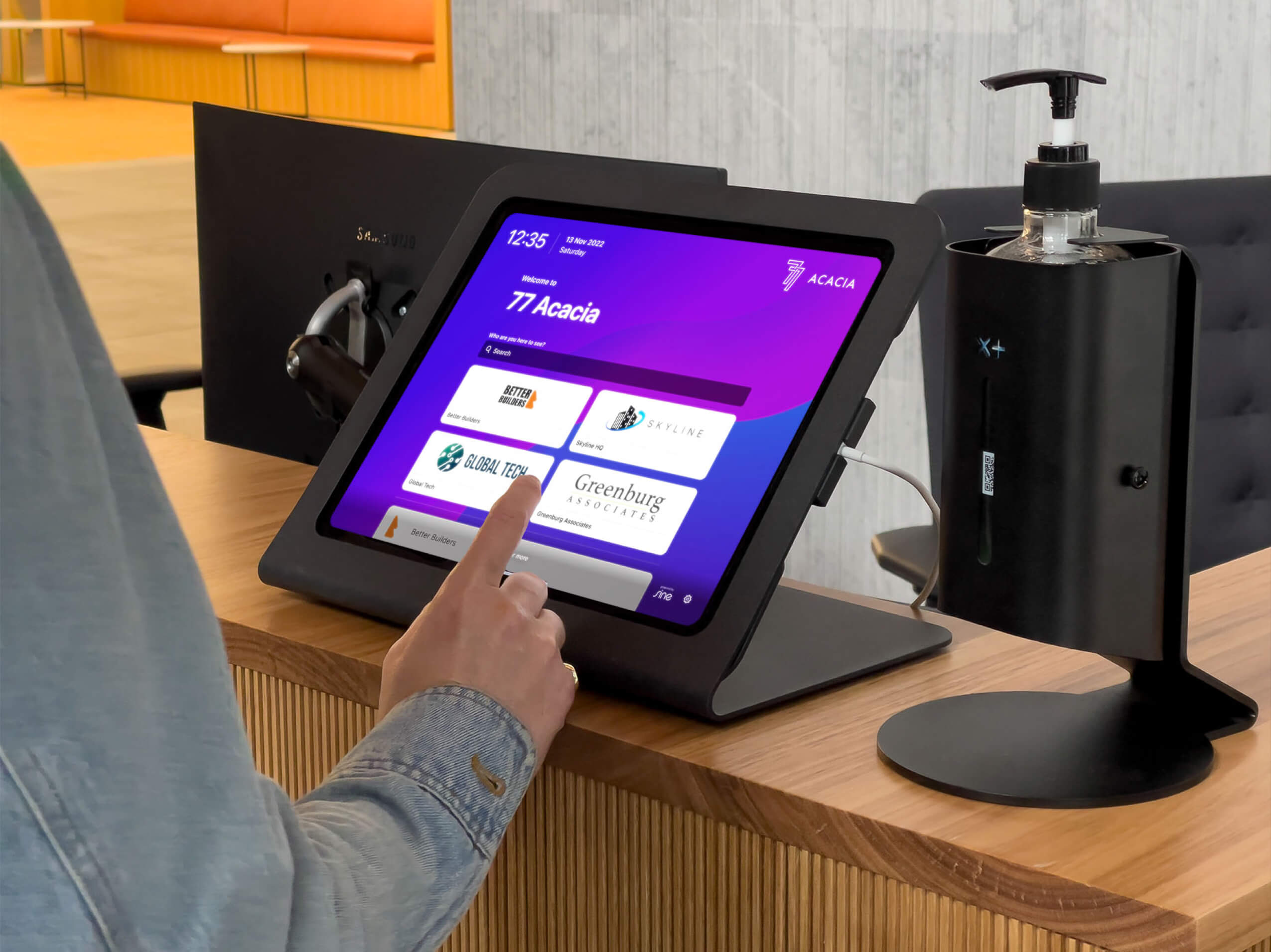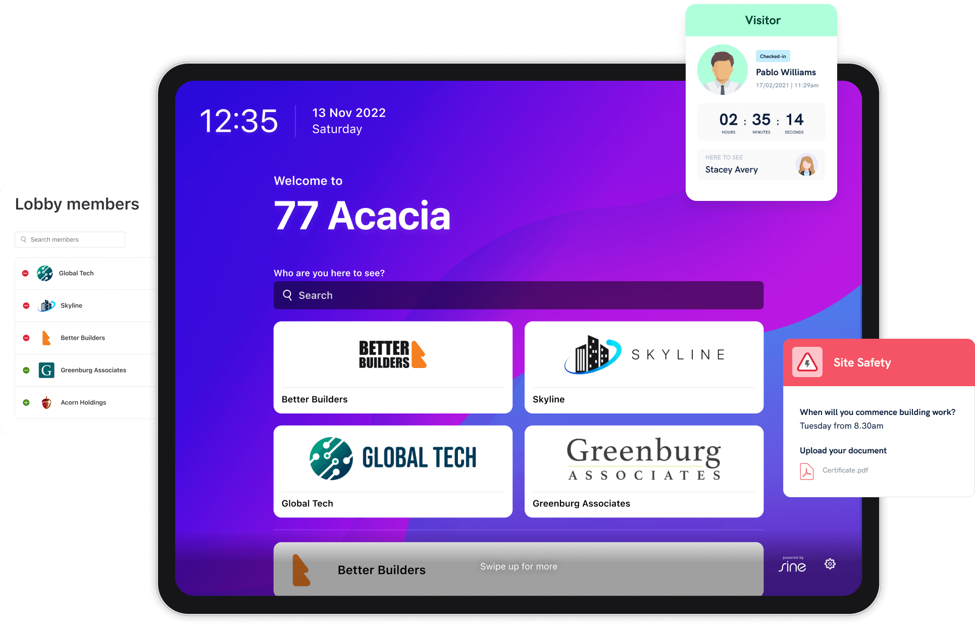 Sine Lobbies, the newest addon for Sine Core, enabled building lobbies to showcase multiple tenant's check-in screens on a single iPad. For the launch, I worked closely with the UX/UI team to take product designs from Figma, clean them up for marketing materials and develop mockups showcasing it's benefits for busy buildings.